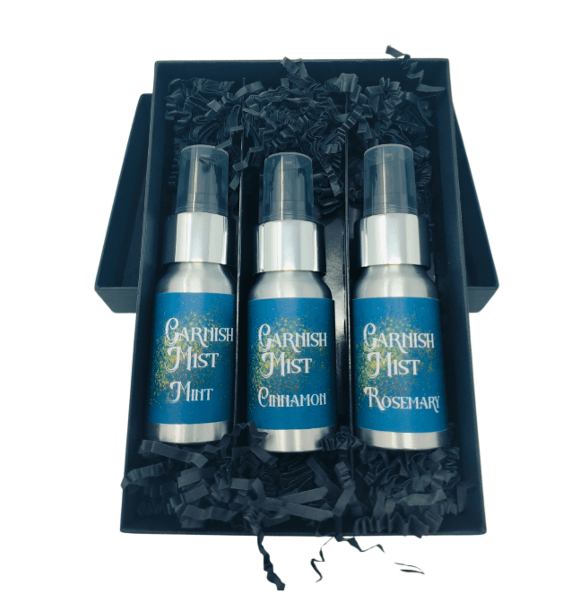 Delight the senses with this Spice/Herb Gift Box, featuring an elegant trio of aromatic garnish mists, with refreshing mint, warm cinnamon, and earthy rosemary. Perfect for enhancing Mulled Wines, Spirits and Cocktails, each mist is crafted to elevate flavour and fragrance with a single spritz. Eliminate the need for fresh fruit garnishes with this eco alternative.
