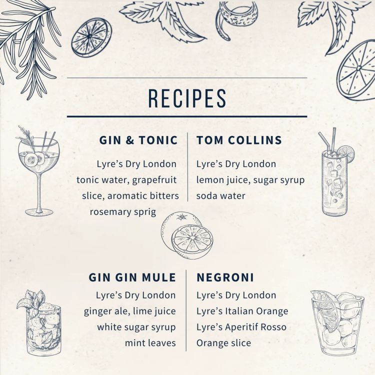 Crafted to capture the essence of a classic London Dry Gin, Lyre’s Non-Alcoholic Dry London Spirit delivers the unmistakable taste of juniper-forward sophistication, without the alcohol.